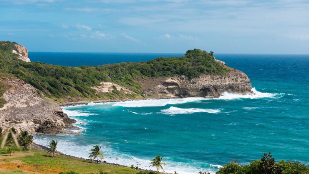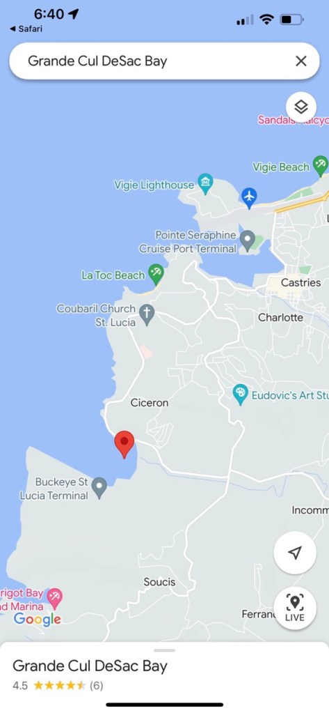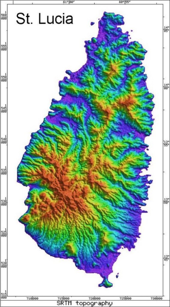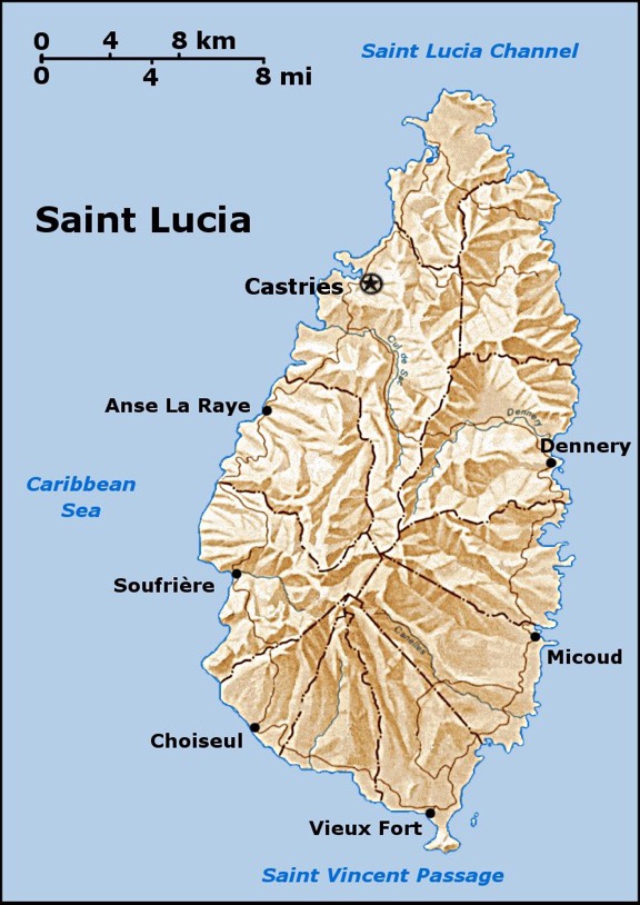 The Island of St. Lucia sits in the southern portion of the lesser Antilles and is the second largest of the windward islands. It is twenty-seven miles long and fourteen miles wide. Large volcanic peaks rise to more than 3,000 feet and split the island down the middle forming into a dense look on the islands southwestern coast. The eastern coast is filled with high rocky cliffs battered by large wind driven waves coming off the Atlantic. This side of the island is in a rain shadow, as moisture is forced up and over the high mountainous spine and creates a verdant tropical rain forest on the western slopes. The rain has carved great valleys, where habitation and port access developed. This is especially true of the island’s northwestern coast, where the modern capital of Castries lies today.