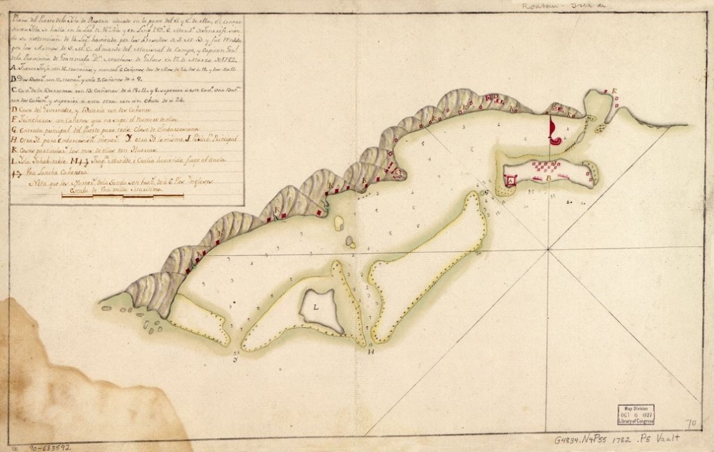 The Battle of Roatan was fought in 1782, as part of the larger American War of Independence. The Mosquito Coast of modern day Nicaragua and Honduras, was an important source of hard woods and had been unsuccessfully settled by the Spanish. Though still claimed as part of their empire, this area was in reality contested between the Spanish and British crowns. British efforts at cementing diplomatic ties with local natives, gave them the upper hand by the 2nd half of the 18th century. The Island of Roatan occupied a strategic position supporting British claims north to the Yucatán and south to Nicaragua. British woodcutters and then pirates made Port Royal their home on the island. Almost 2,000 souls occupied the site at its high point, with Port Royal defended by two fortifications called Fort Dallings and Despard. These were situated respectively at the opening mouth of the harbor.