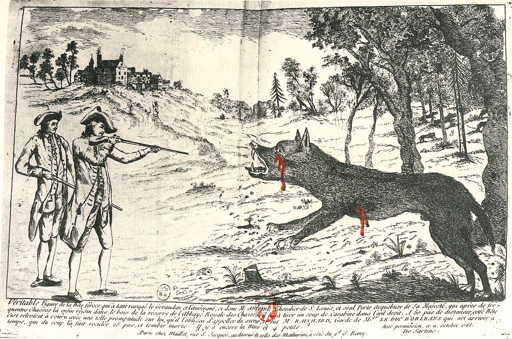 France had experienced a famous outbreak of loup -garou sightings between the years of 1764-1767, that are collectively known as the “Beast of Gevaudan.” The French Royal Court applied considerable funds and manpower to hunt down this legendary creature. 30,000 Soldiers and hunters combed the countryside in an attempt to staunch the unnatural violent occurrences. Close to 100 confirmed victims and several hundred attacks were attributed to the beast. Royal agents were able to corner and slay a monstrous wolf pair and their cub, but attacks continued. Another large wolf was also slain a year later by a local farmer as the attacks continued. Mysteriously the attacks ceased in France, but picked up across the ocean in the former colony of Quebec.